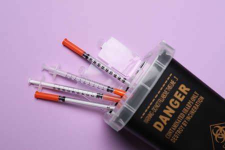 Disposable syringes and sharps container on violet background, top view