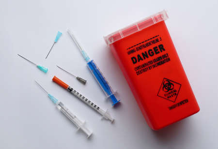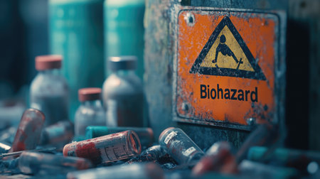 A close-up of a warning sign that reads Biohazard next to a pile of hazardous medical waste, including used syringes and vials.