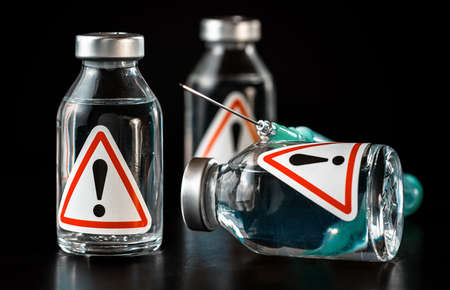 Vaccine bottles with red triangle exclamation mark sign on label, black background