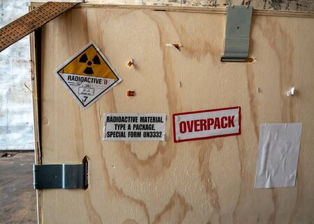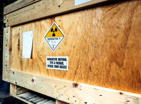 Radioactive material label beside the transportation wooden box Type A standard package