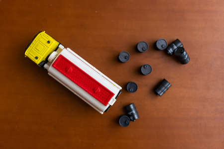 Opened toy barrel of oil on dark background