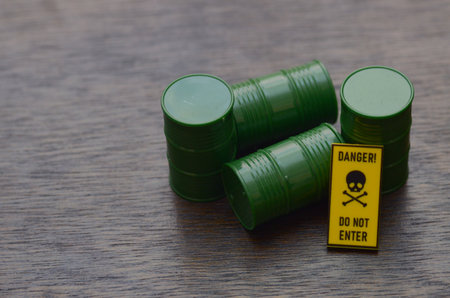 Mini Barrels Leaking Green Toxic Waste Beside Skull Symbol and 'Do Not Enter' Sign