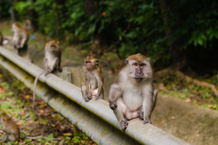 funny macaque monkey sitting on asphalt road