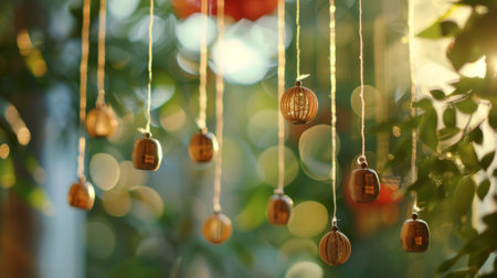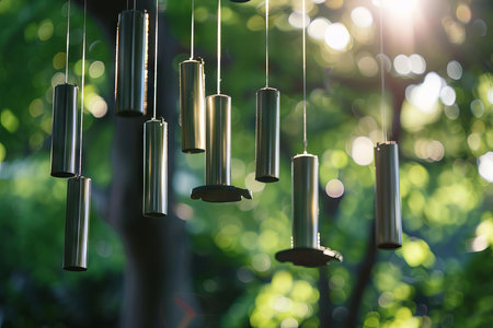 Metallic wind chimes hanging in a gentle breeze, reflecting sunlight onto nearby surfaces