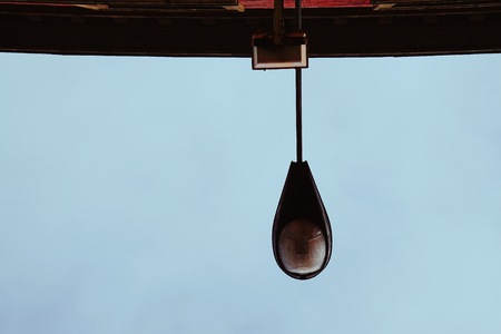 Pair of black sneakers hanging on a rope. Shallow depth of field