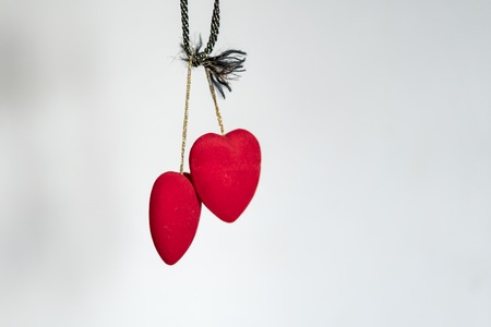 A red heart shaped pendant hanging from a chain on tree branch, AI