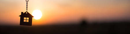 Silhouette of a house figure with a key, a pen with a keychain on the background of the sunset. They dream of a house, building, moving to a new house, mortgages, renting and buying real estate. Copy space