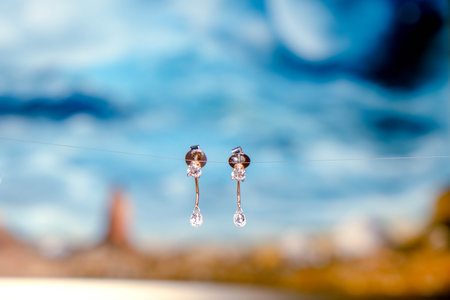 This stunning image showcases elegant teardrop earrings delicately hanging from vibrant green leaves, illuminated by soft natural light. It beautifully merges nature and jewelry design.