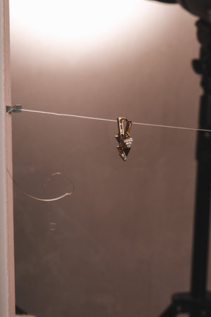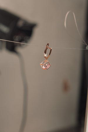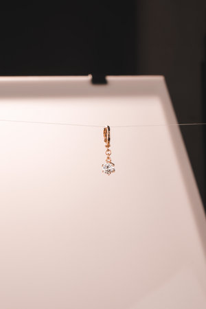 A close-up captures a gemstone pendant, pear-shaped, showcasing a peach-colored gem. The silver setting sparkles. The smooth, reflective surface below suggests an indoor setting with cool lighting. The image could be suitable for jewelry advertisements or editorial content.
