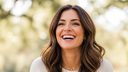 A woman with long brown hair laughs with her eyes closed. The image displays natural lighting and a soft focus background. This photograph could be used for various projects, including advertising campaigns, websites, or editorial content related to happiness.