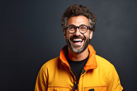 A confident man smiles broadly while wearing glasses, exuding charisma and happiness in a stylish indoor environment. His joyful expression radiates warmth.