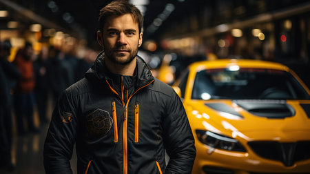 Portrait of a handsome young man in sportswear standing in front of a yellow sport race car. Generative AI.