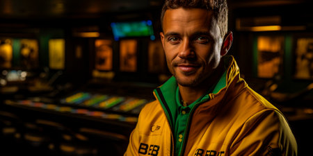 Cheerful bearded man with headphones waving and smiling at the camera, seated in a sunny sports stadium with yellow seats.