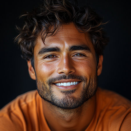 This vibrant portrayal captures a Brazilian man, exuding happiness with a warm smile, immersed in a cozy atmosphere filled with natural light and personal touches.