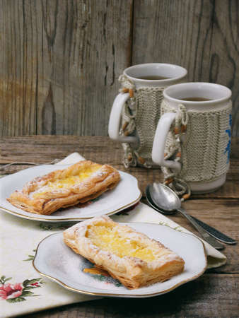 puff pastry with custard and a cup of tea on a wooden background. selective focus