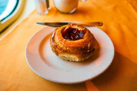 A golden tablecloth showcases a charming setting: a small plate holding a flaky cherry Danish, its vibrant filling adding a pop of color to the elegant arrangement.