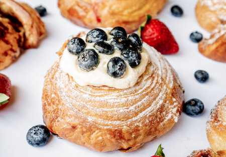 Delicious lemon pie croissant dough role with blackberries on top on a white table and flavored roles around in close up concept.