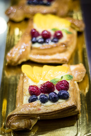 Closeup of fancy gourmet fresh fruit dessert tarts