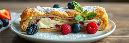 Puff pastry with strawberries, blueberries. Long banner format. top view. copy space for text,