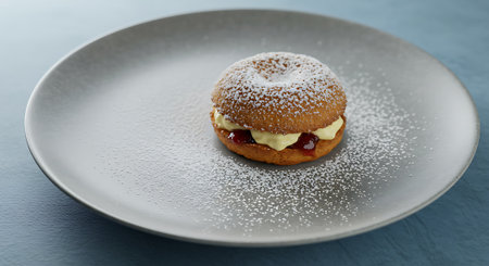 Cream puff with blueberry on wooden background. Sweet dessert.