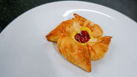 danish pastry toppings with blueberry jam and many kind of bakery on wooden background