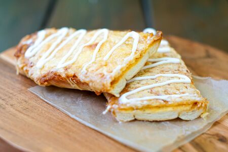Blueberry glazed danish dessert pastries with icing and powdered sugar