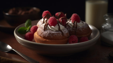eclairs decorated with fresh berries on a white plate, handmade, culinary theme, close up