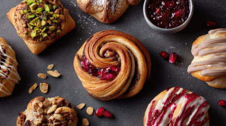 Sweet craffin or panettone garnished with raspberry and pistachio flavored cream on a dark concrete background