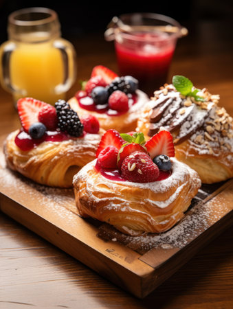 Danish fruit bakery homemade with strawberry and blueberry toppings on a wooden tray ready to serve.