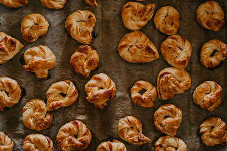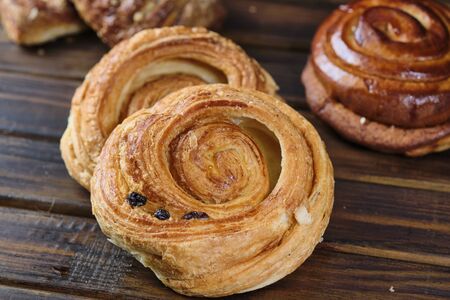French puff pastry buns, stuffed with buttercream and currant on the table, close-up