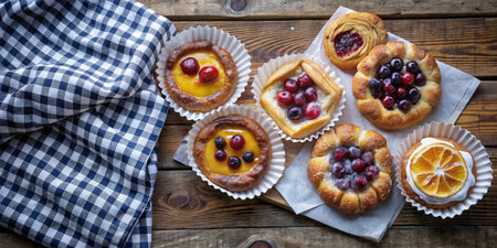 Assortment of fruit pastries elegantly displayed on a checkered cloth.