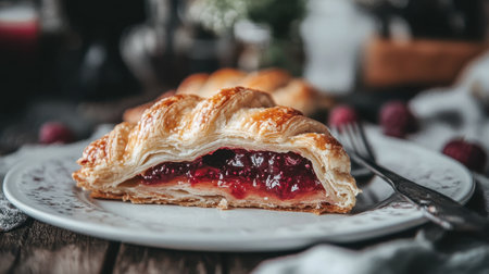 A beautifully presented slice of flaky pastry filled with sweet cherry filling sits on a white plate, capturing the essence of cozy kitchen moments.
