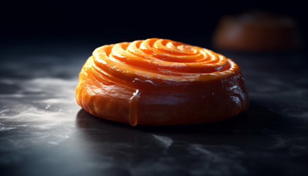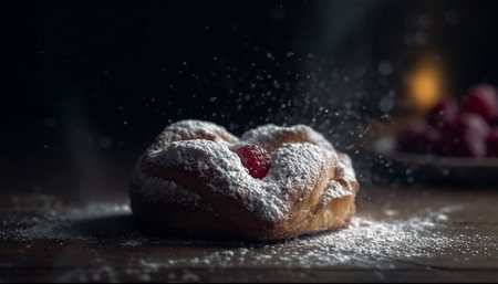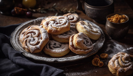 Freshly baked sweet pastry on rustic wooden table, ready to eat indulgence generated by artificial intelligence