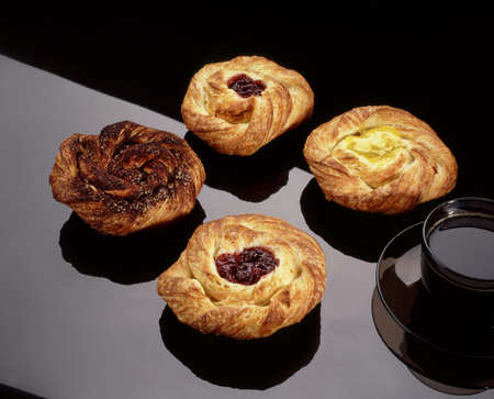 Rum denish on wood tray served with hot coffee, popular drink and bakery, high sugar and trans fat caused serious chronic disease such as diabetes.