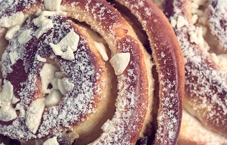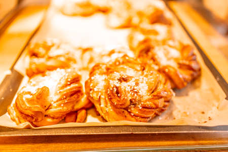 Twisted traditional Swedish cinnamon rolls at a cafe. High quality photo