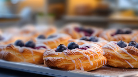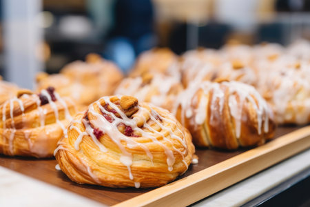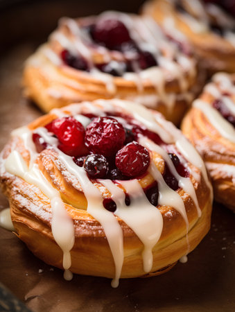 A tempting array of freshly baked pastries, featuring vibrant glazes and flaky textures, ideal for dessert lovers and food enthusiasts in a cozy bakery setting.