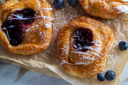 Blueberry glazed danish dessert pastries with icing and powdered sugar