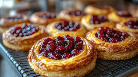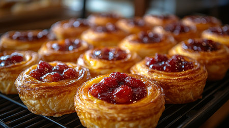 Freshly baked pastries topped with vibrant cherry filling at a local bakery during morning hours. Generative AI