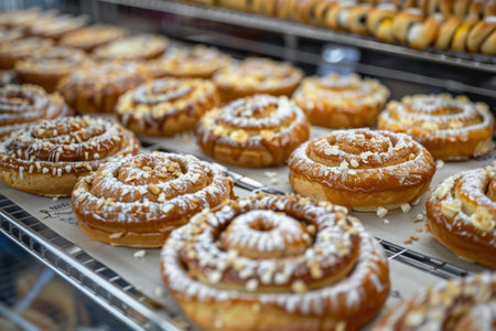 Golden bakery swirls with sugar icing neatly stacked on a rustic display
