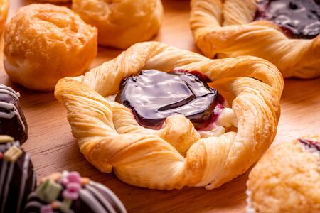 danish pastry toppings with blueberry jam and many kind of bakery on wooden background