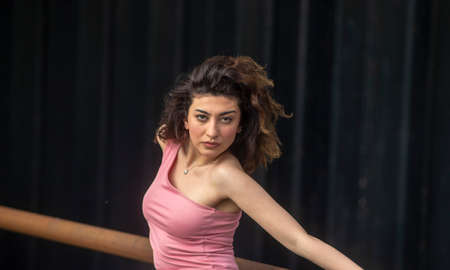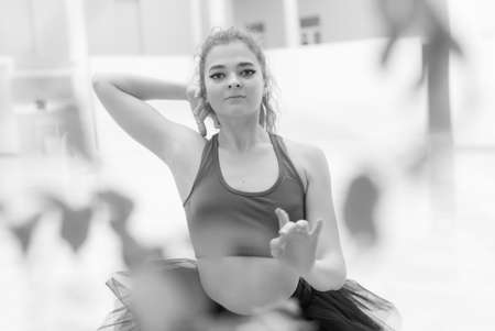 Young beautiful dancer posing on a studio background. Woman dancer in the gym.