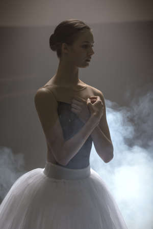 Young pretty ballet dancer with arms crossed on her chest. Smoke curled around her. Light falls softly behind dancer. Shoot in a low key. Vertical.