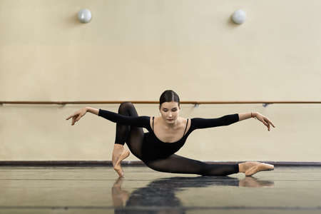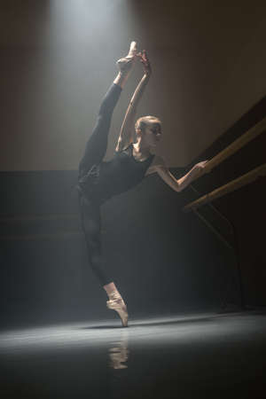 Pretty ballerina makes a pose under the falling light. She is outstretching her legs and one arm. One hand she puts on the barre. Low key photo.