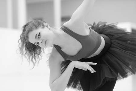 Ballerina in a black dress and in pointe shoes performing a dance on a light background tutu leotard