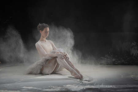 Young ballerina sitting on the floor in the dance hall. She clasps her hands one leg while the other leg is stretched forward. She is reflected on the floor surface. Smoke curled behind her. Light falls from above. Low key photo.
