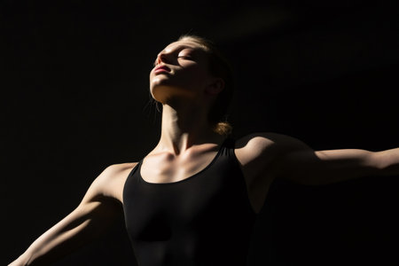 Young female ballet dancer with arms outstretched, eyes closed, and head tilted back in a dark room, illuminated by a single light source