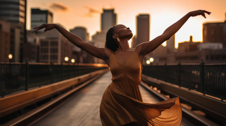 An African woman expressing joy and freedom through dance in an urban setting. AI-generated.