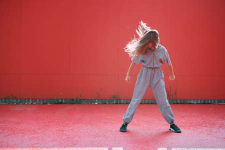 Stylish active teen girl with long waving hairs wearing modern clothes on red background with copy space for advertising