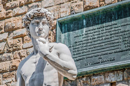 Copy of Michelangelo's David statue standing in its original location, in front of the Palazzo Vecchio at Piazza della Signoria in Florence, Italy
