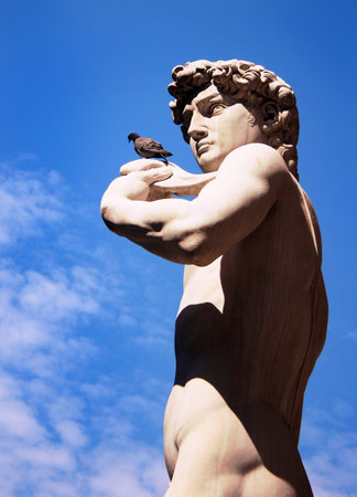 The famous David sculpture by Michelangelo and a pigeon, in Florence, Italy
